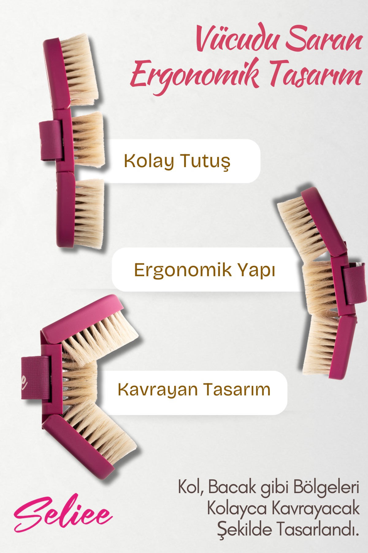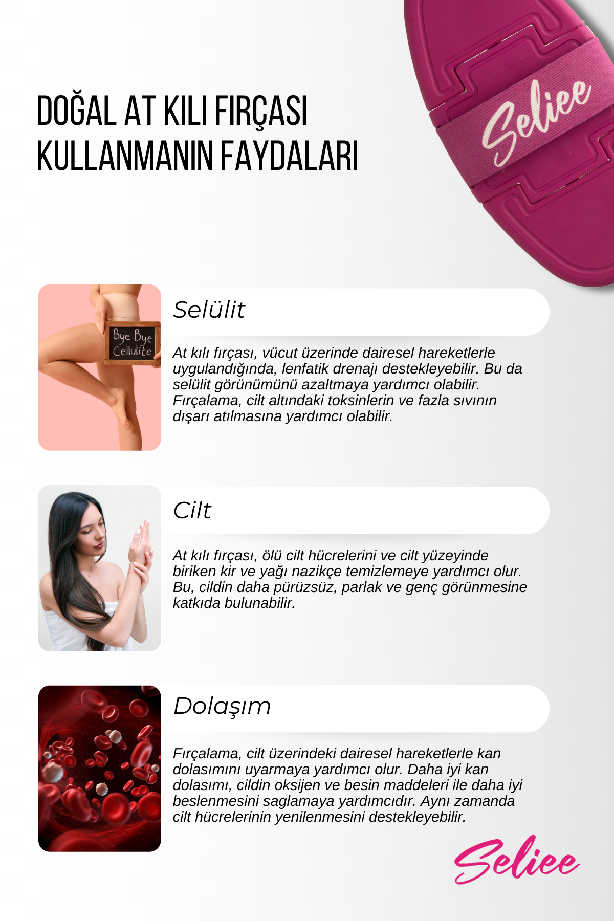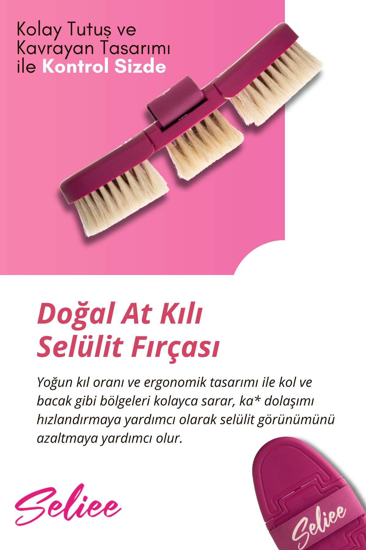 “Selülit görünümüne karşı doğal bir çözüm arıyorsanız, Seliee doğal at kılı vücut fırçası tam da size göre! %30 daha fazla kıl yoğunluğu ve ergonomik tasarımı ile Seliee sizlere daha etkili bir fırçalama deneyimi sunuyor. Seliee esnek tasarımı ile vücudunuzun hemen hemen her yerine ulaşmayı sağlar.Doğal at kılı sayesinde cildinizin masaj etkisi ile canlanmasına ve selülit görünümünün azalmasına yardımcı olur.  Ergonomik şekli elinize rahatça oturur, bu da bilek gerginliğinizi ve fırça üzerindeki kavrama çabanızı azaltırır”